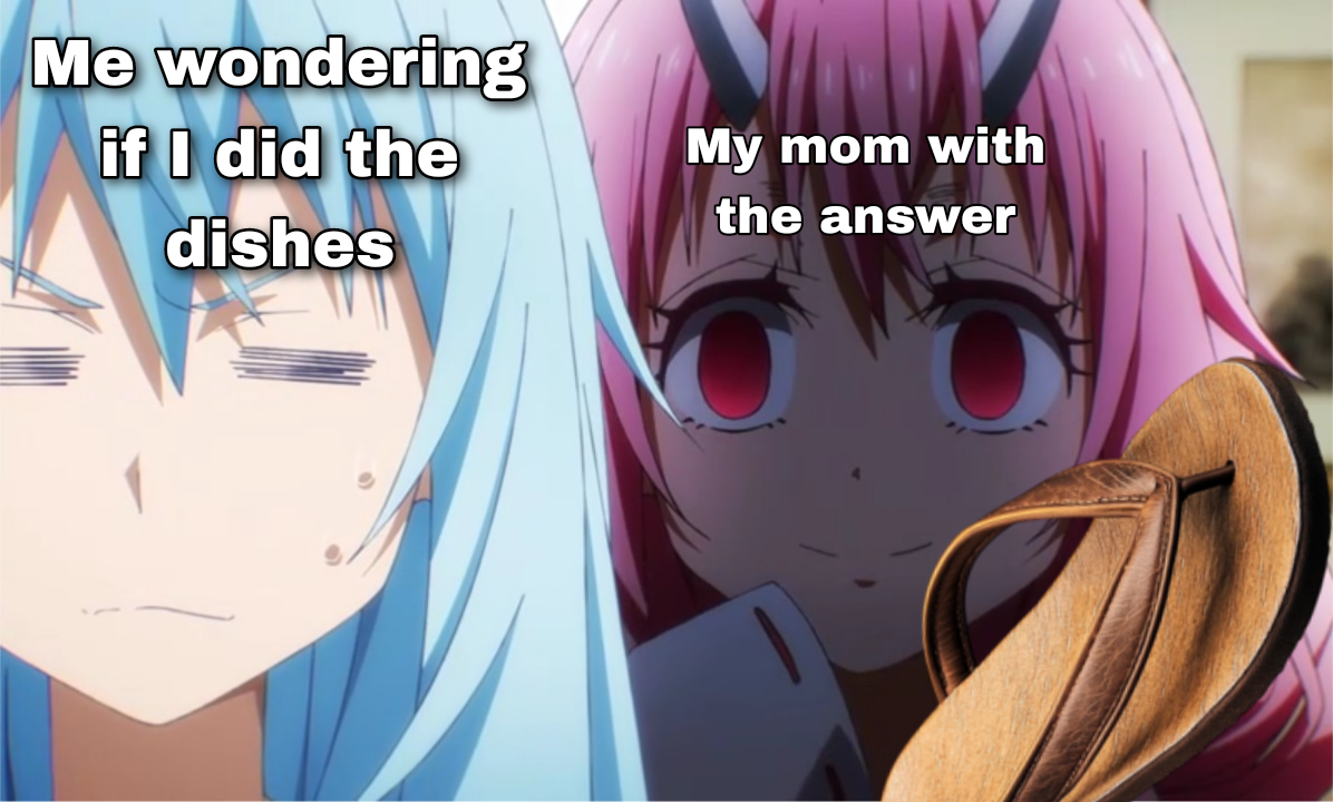 An anime meme showing a character worried about chores while their mom approaches with a sandal. A relatable look at fear and household consequences.