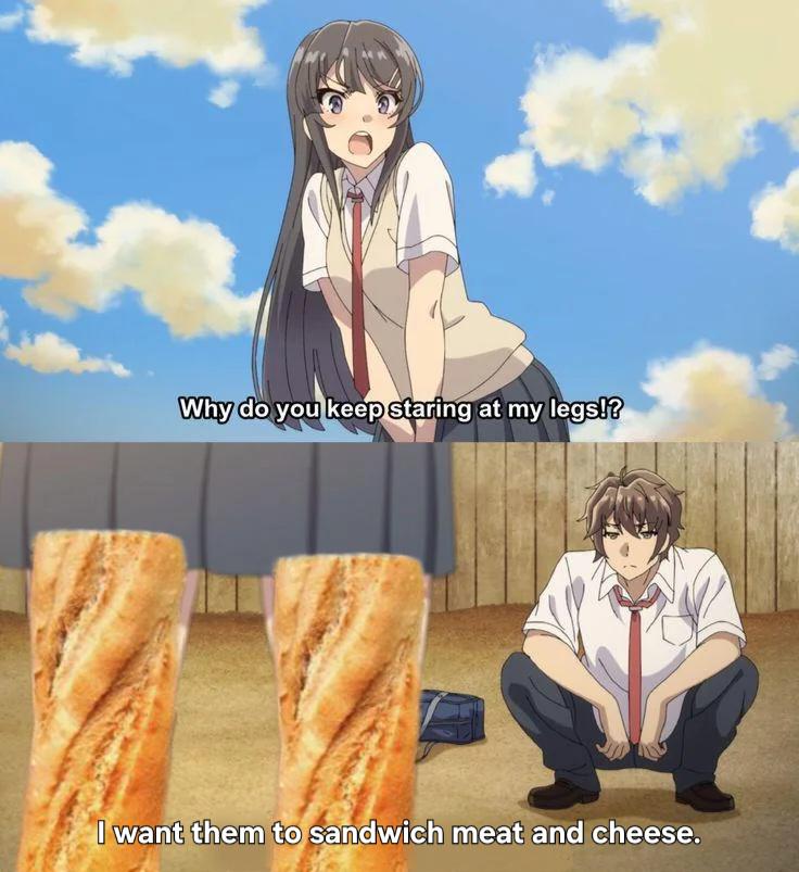 An anime meme featuring Mai Sakurajima asking why someone is staring at her legs, while the other character reveals they are actually French bread baguettes.
