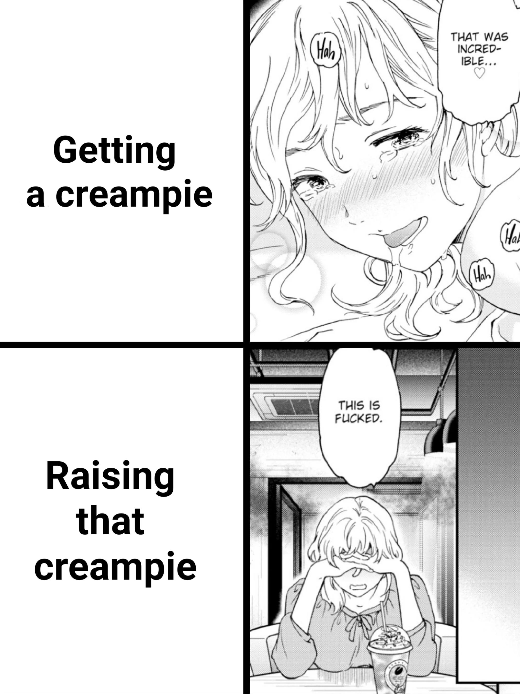 Watch this spicy meme contrast: getting a creampie is bliss, raising that creampie hits hard. Viral meme for edgy anime memes and relatable reaction content.