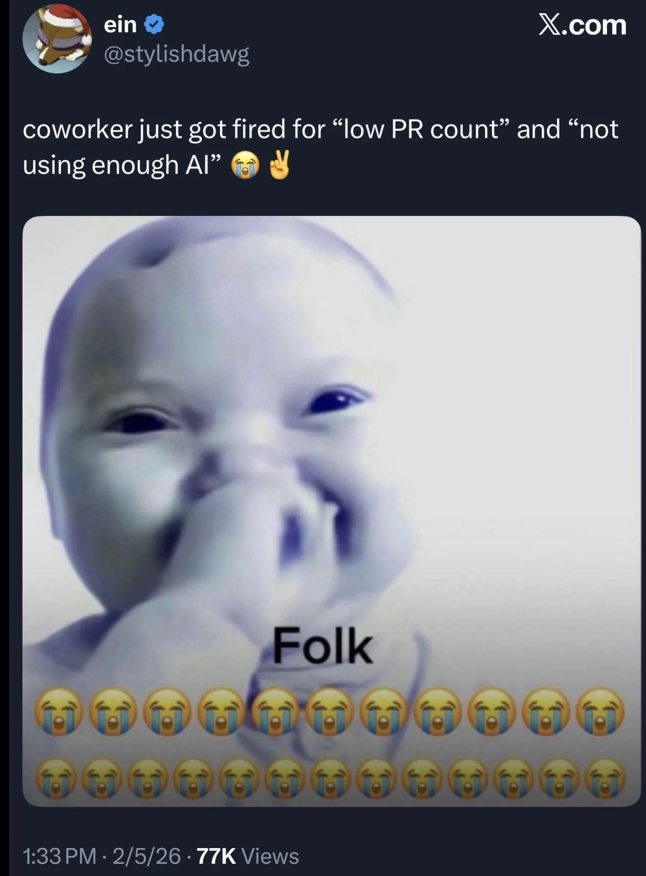 A satirical social media post about a developer losing their job for low pull request activity and AI usage, featuring the viral Folk baby reaction meme.