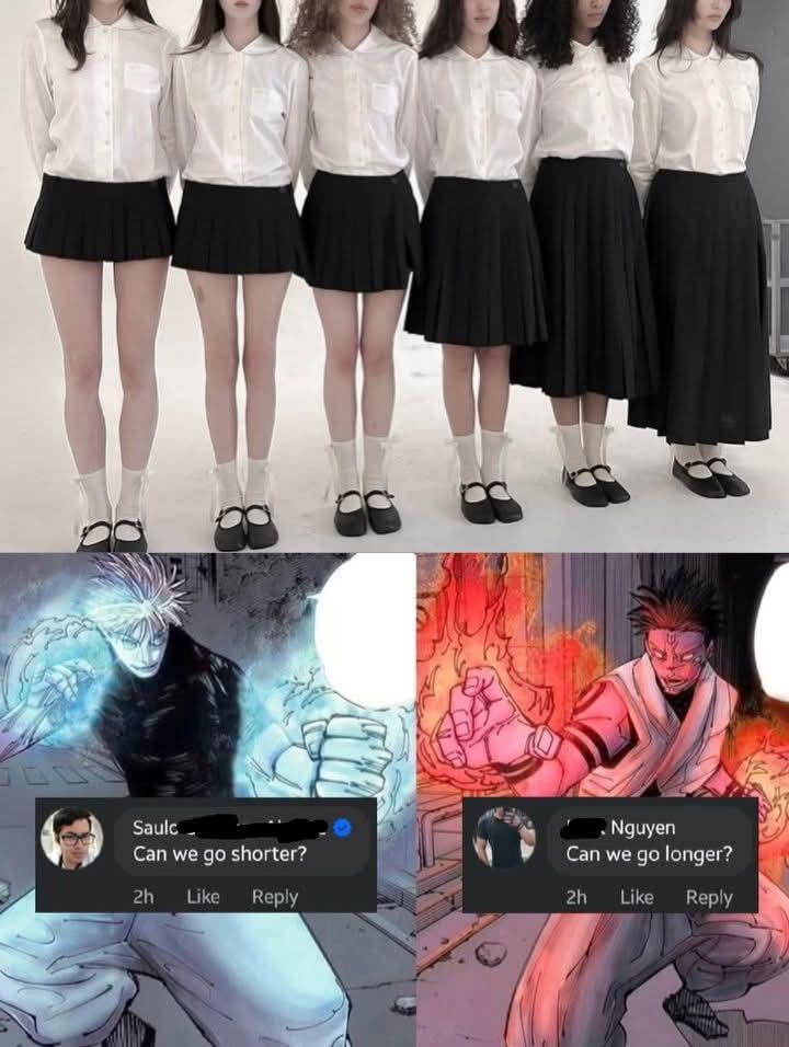 This FunnyMemes, ReactionMemes, FashionMemes meme features Top: Six people standing side by side wearing white blouses and black pleated skirts of varying lengths from very short to ankle length. Bottom: Two anime-style fighters with blue and red energy; overlaid comment boxes read "Can we go shorter?" on the left and "Can we go longer?" on the right.. Created and shared on Jart.lol, this image meme represents the best of internet culture and humor.