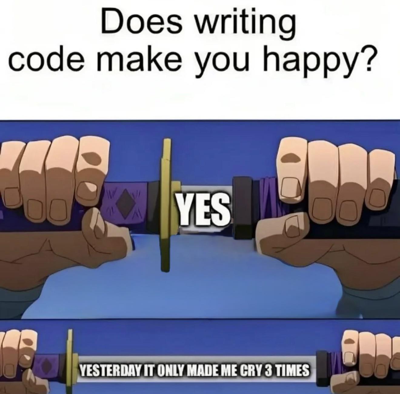 This FunnyMemes, WorkMemes, ProgrammingMemes meme features Anime-style hands holding sword with text 'Does writing code make you happy?' with 'YES' on sword and 'Yesterday it only made me cry 3 times' below.. Created and shared on Jart.lol, this image meme represents the best of internet culture and humor.