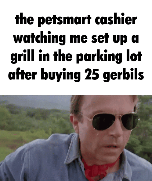 This FunnyMemes, ReactionMemes, ViralMemes meme features Text reads: 'the petsmart cashier watching me set up a grill in the parking lot after buying 25 gerbils' above a surprised man in sunglasses looking alarmed, outdoors.. Created and shared on Jart.lol, this animated GIF meme represents the best of internet culture and humor.
