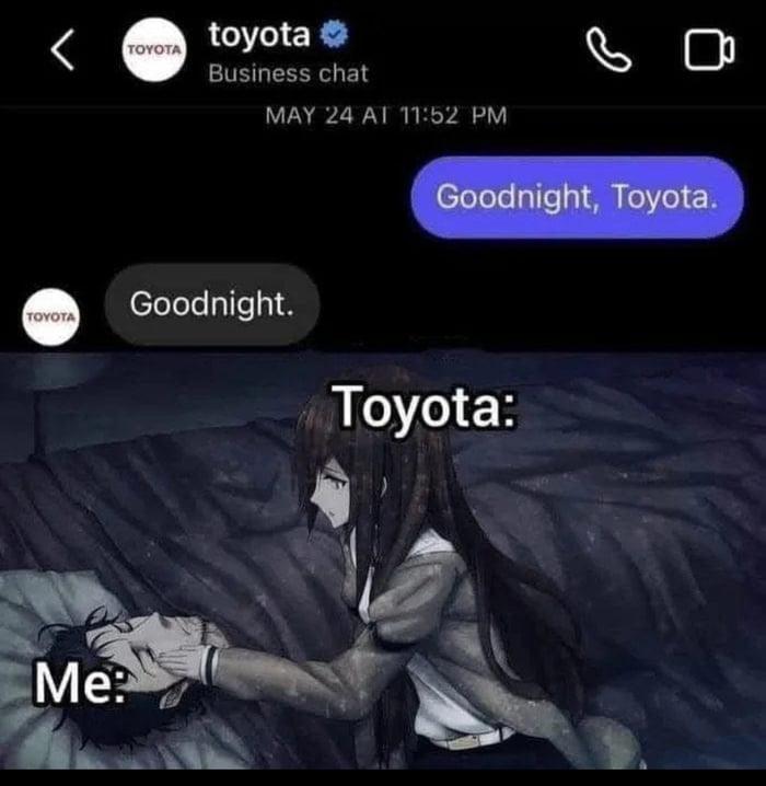 Unexpected wholesome reply turns a corporate DM into a viral meme about comfort. This Toyota meme mixes anime vibes and brand reply memes for epic laughs.