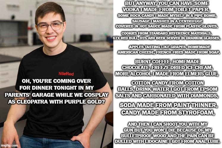 Nigel Braun from the science channel NileRed discusses a chaotic dinner menu featuring dangerous homemade items in this satirical list meme format.