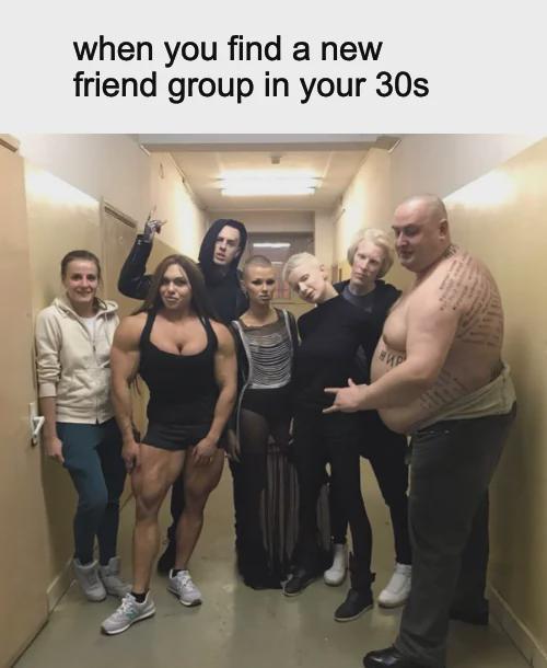 Discover this funny meme about the unexpected variety of personalities you encounter when searching for a new friend group during your thirties.