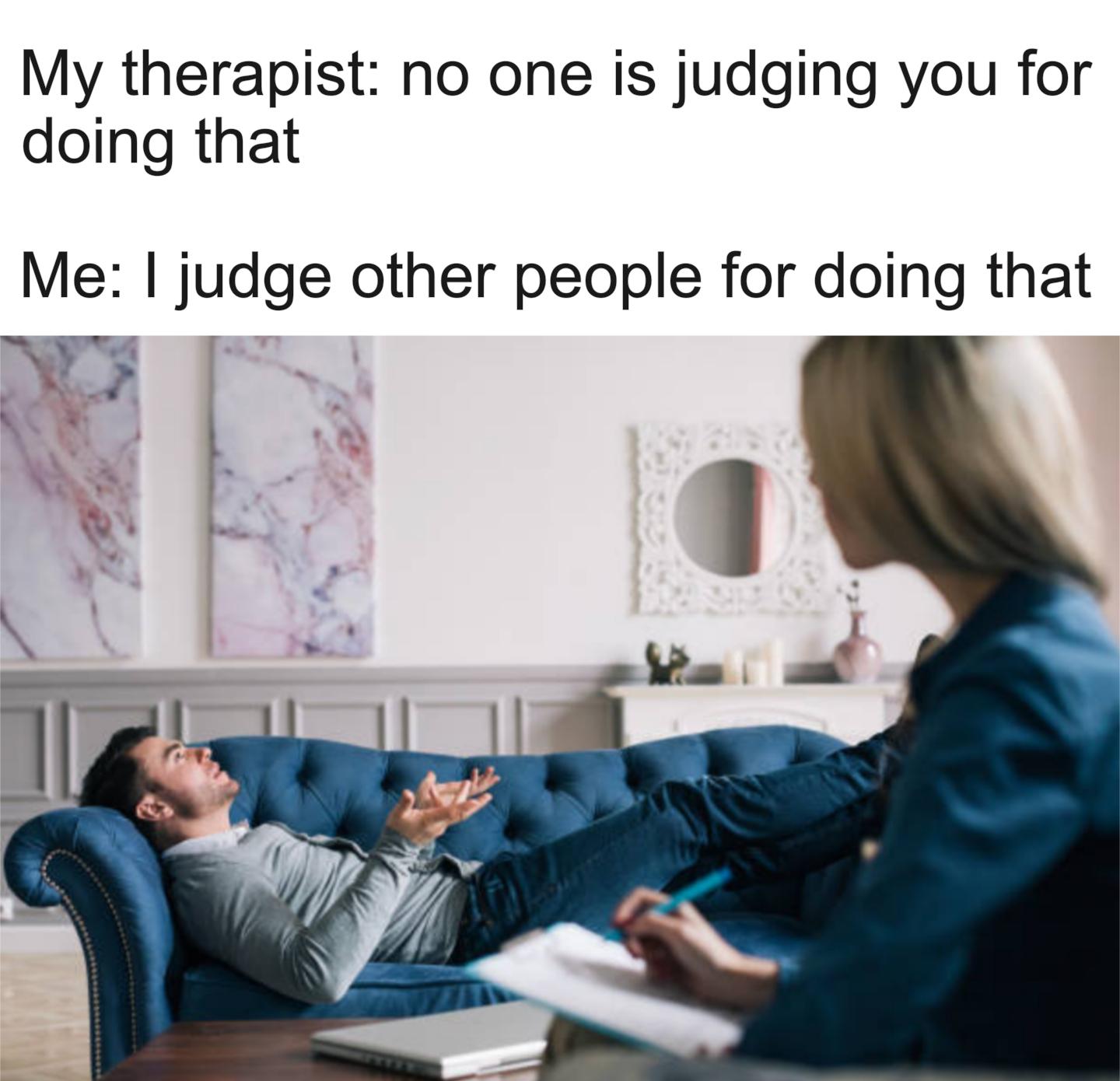 #therapy humor #relatable #awkward #psychology #mental health #image macro #judgment #hypocrisy #funny #self awareness #therapy session #social anxiety