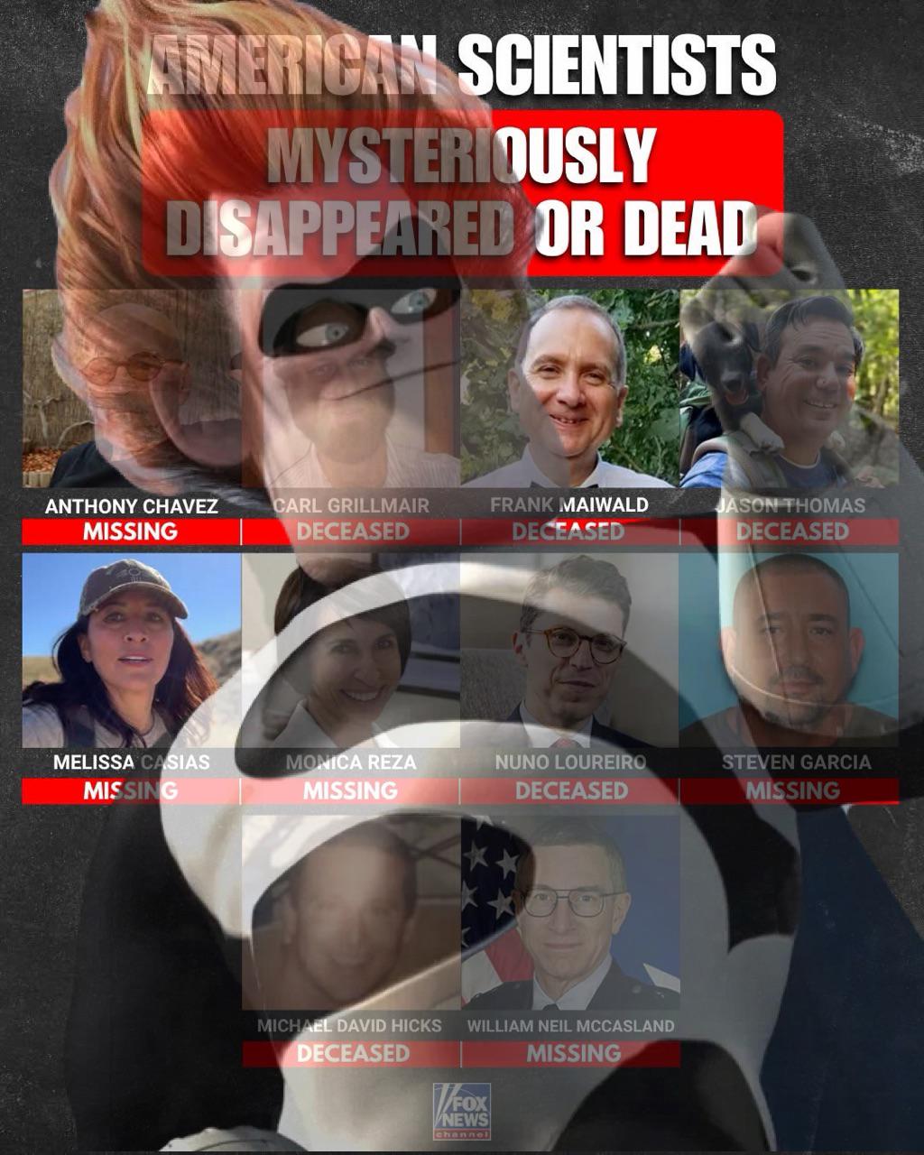 A dark conspiracy meme featuring the Mr Incredible Uncanny template layered over a list of scientists, blending internet humor with unsettling headlines.