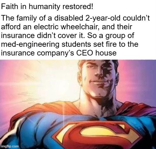 This FunnyMemes, ReactionMemes, ViralMemes meme features Superman smiling heroically with upper text saying 'Faith in humanity restored! The family of a disabled 2-year-old couldn't afford an electric wheelchair, and their insurance didn’t cover it. So a group of med-engineering students set fire to the insurance company’s CEO house'. Created and shared on Jart.lol, this image meme represents the best of internet culture and humor.