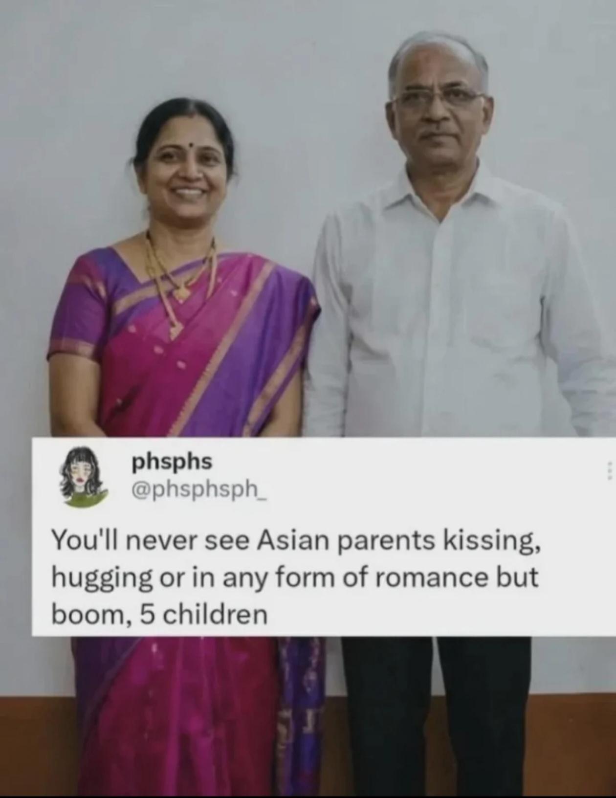 A relatable meme highlighting the contrast between the lack of public affection shown by Asian parents and the reality of having a large family at home.