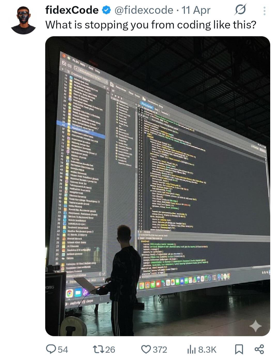 A developer stands before an impossibly large computer monitor showcasing code in this relatable tech meme about unrealistic software engineering standards.