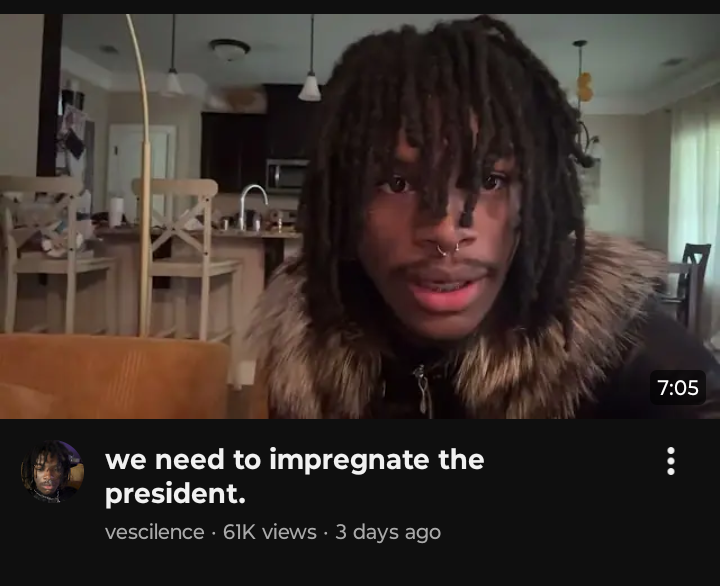 A screenshot of a YouTube video by Vescilence with the absurd title we need to impregnate the president. This bizarre meme captures internet chaos perfectly.