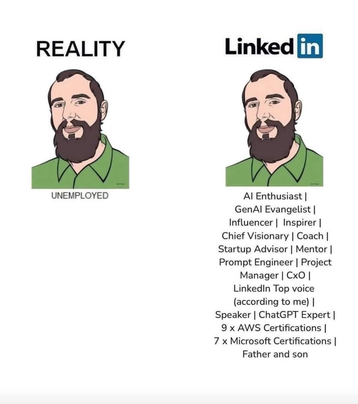 This FunnyMemes, WorkMemes, RelatableMemes meme features Split image cartoon of a bearded man. Left side labeled 'Reality' says 'UNEMPLOYED'. Right side labeled 'LinkedIn' lists exaggerated job titles like AI Enthusiast, GenAI Evangelist, and more.. Created and shared on Jart.lol, this image meme represents the best of internet culture and humor.