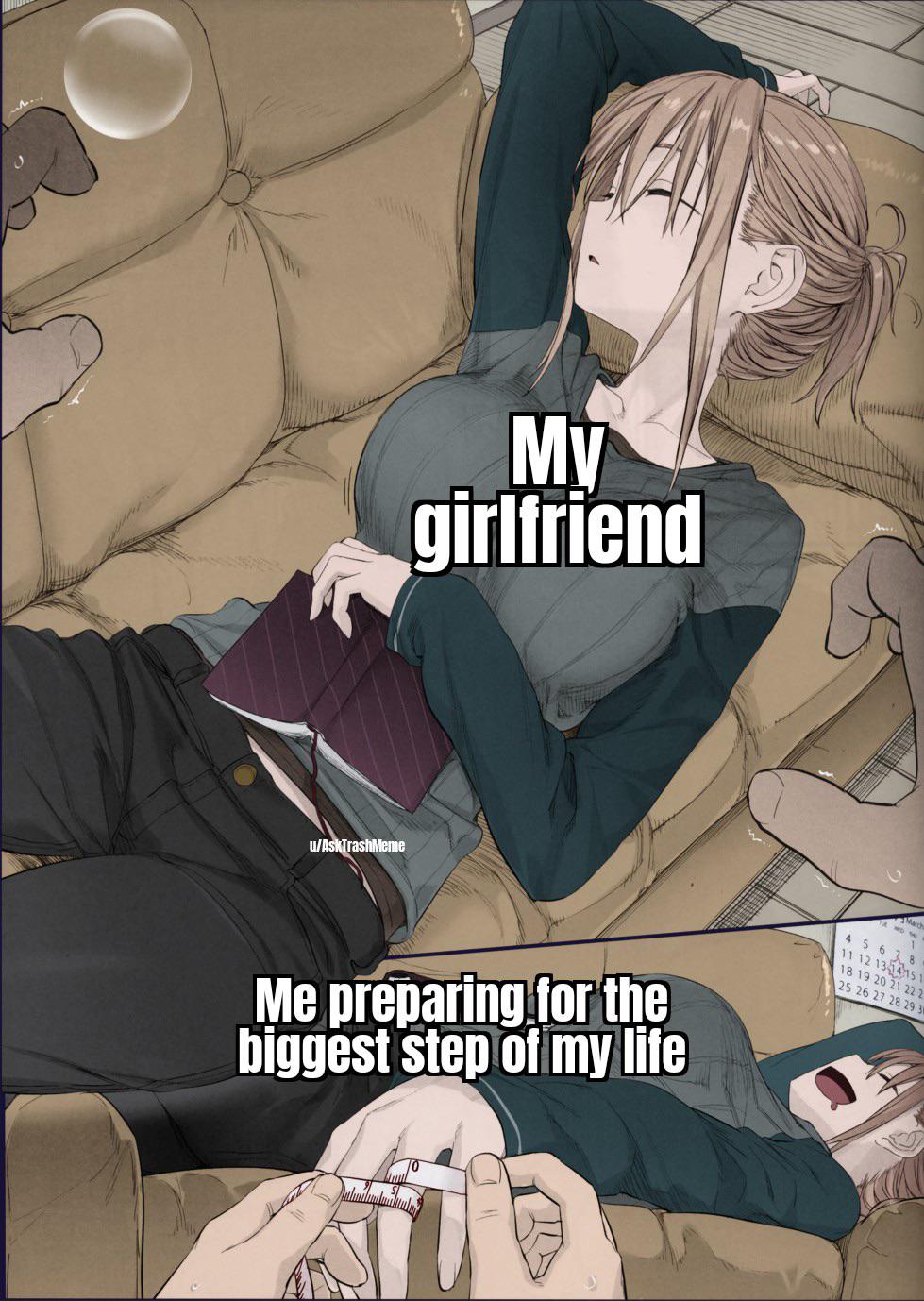 An anime style illustration showing a person measuring a sleeping girlfriend's finger with a tape measure to prepare for a secret marriage proposal meme.