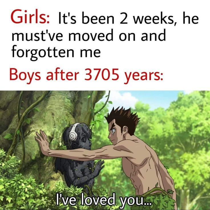 This FunnyMemes, AnimeMemes, ReactionMemes meme features Top text: 'Girls: It's been 2 weeks, he must've moved on and forgotten me' then 'Boys after 3705 years:' Below, an anime scene of a shirtless young man in leaves reaching toward a petrified stone figure with headphones in a forest. Bottom caption reads: 'I've loved you...'. Created and shared on Jart.lol, this image meme represents the best of internet culture and humor.