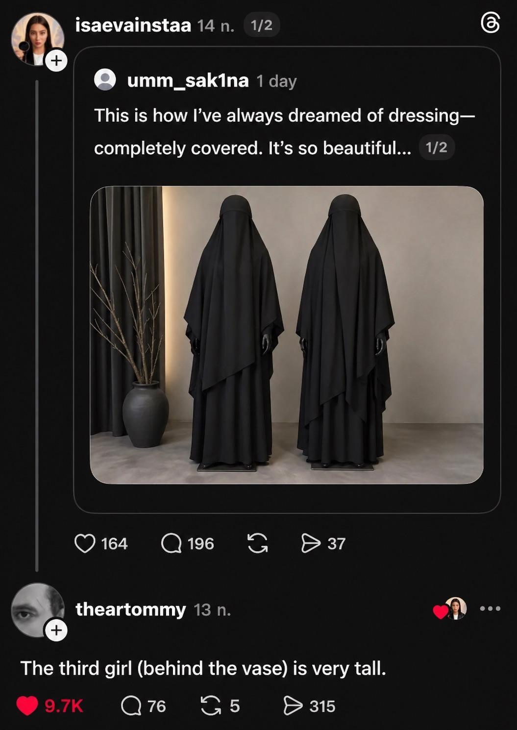 A Threads post featuring two figures in black abayas leads to a hilarious comment about a third tall girl hiding behind a decorative vase in the room.
