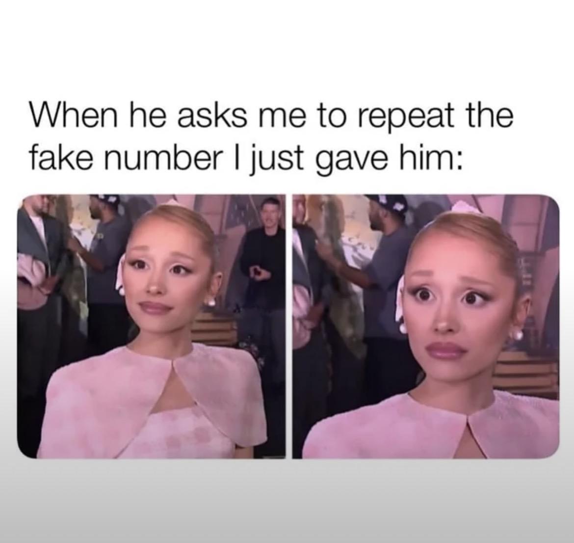This humorous meme captures the panic of being asked to repeat a fake phone number you just gave out, featuring a relatable reaction from Ariana Grande.
