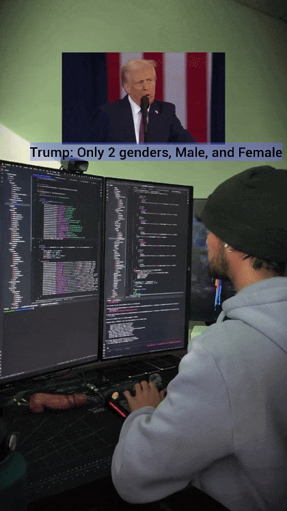 This FunnyMemes, ReactionMemes, ProgrammingMemes, PoliticalMemes meme features A split image with a screenshot of Trump saying 'Only 2 genders, Male, and Female' and a man in a hoodie frantically typing on two monitors displaying code.. Created and shared on Jart.lol, this animated GIF meme represents the best of internet culture and humor.