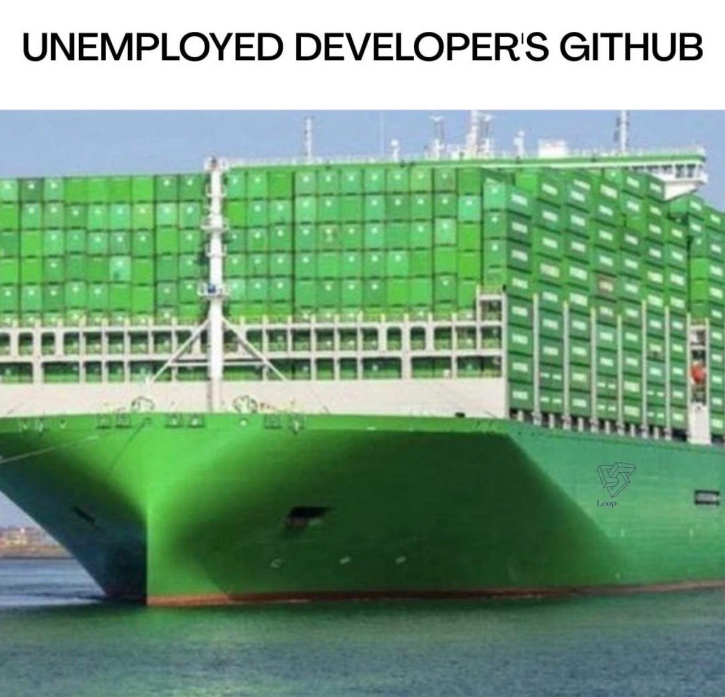 Epic unemployed developer GitHub meme showcases a giant green ship, symbolizing endless commits. Viral tech humor for all code memes fans. Classic image macro.