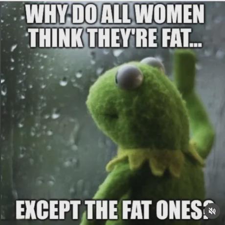 Kermit the frog looks out a rainy window in this classic meme template, posing a provocative question about women's body image and societal perceptions.