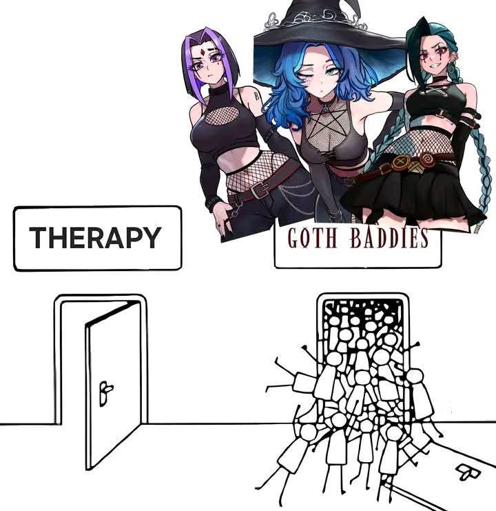 This FunnyMemes, ReactionMemes, AnimeMemes meme features Line drawing of two doors; left door labeled 'THERAPY', right door labeled 'GOTH BADDIES' with three anime goth girls pasted above it. A crowd of stick-figure people are bursting through the 'GOTH BADDIES' door while the therapy door stands empty.. Created and shared on Jart.lol, this image meme represents the best of internet culture and humor.