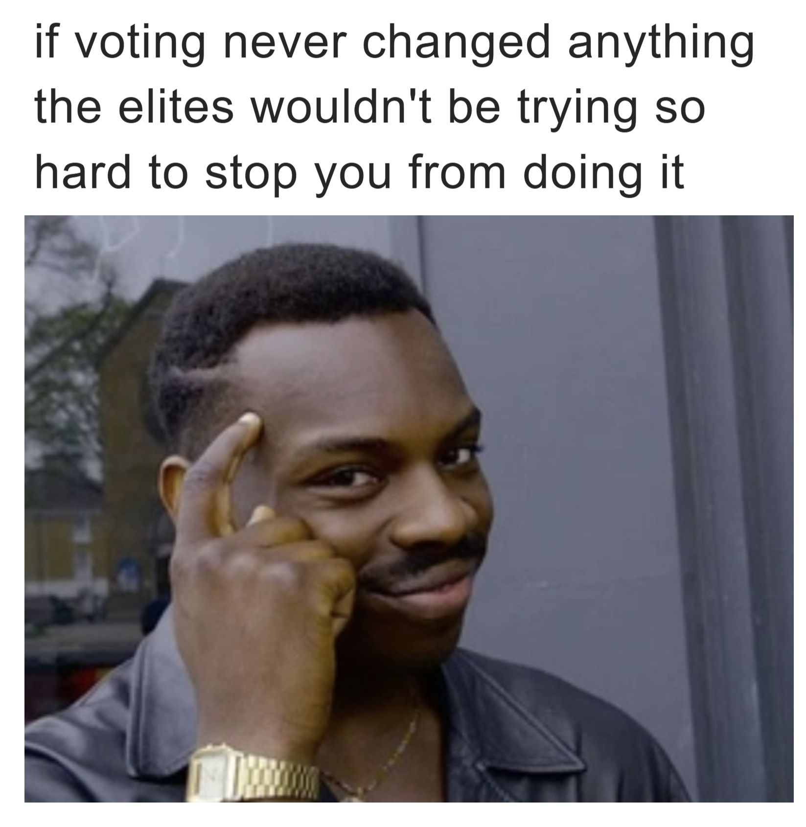 A man taps his temple in this classic Roll Safe meme, suggesting that if voting did not change anything, elites would not try so hard to stop you from doing it.