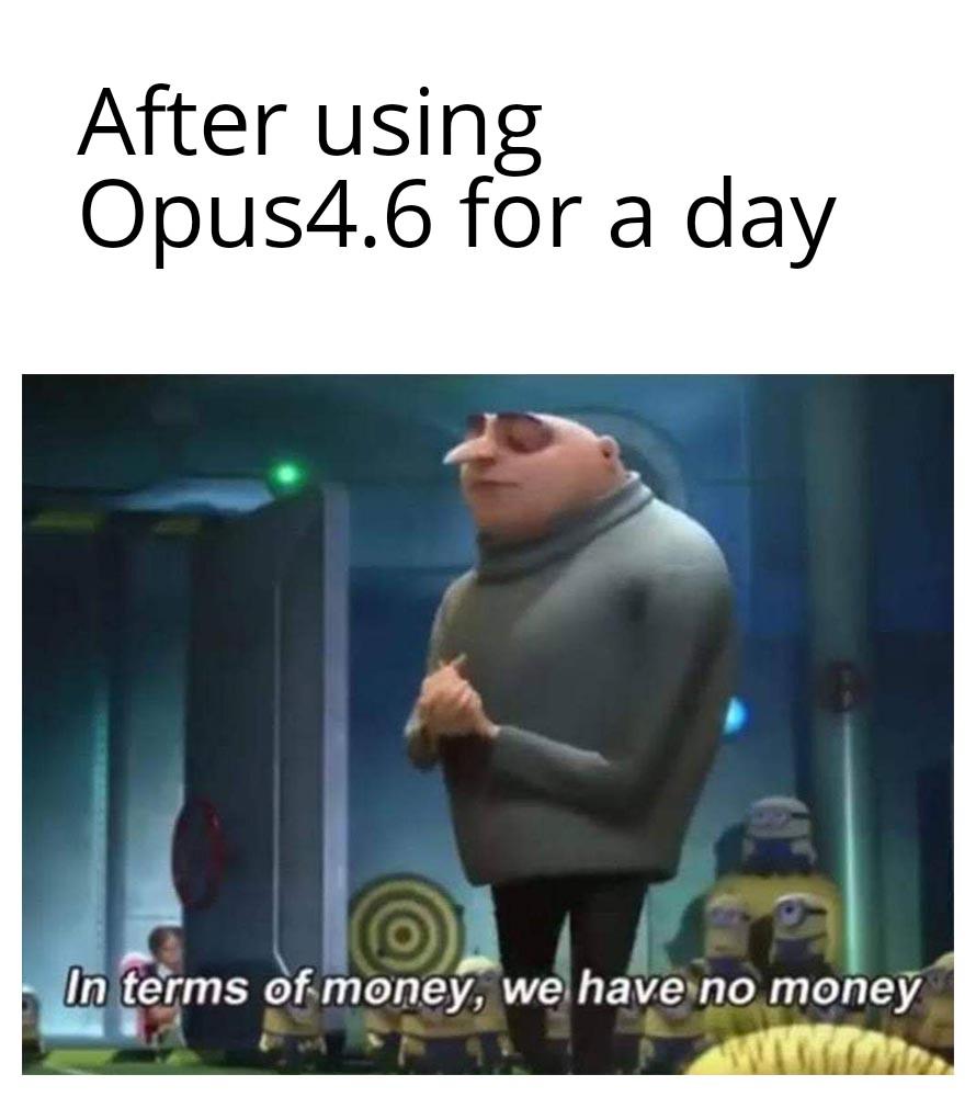 This Despicable Me meme features Gru saying he has no money, used to represent the feeling of being broke after paying for expensive AI tools like Opus 4.6.