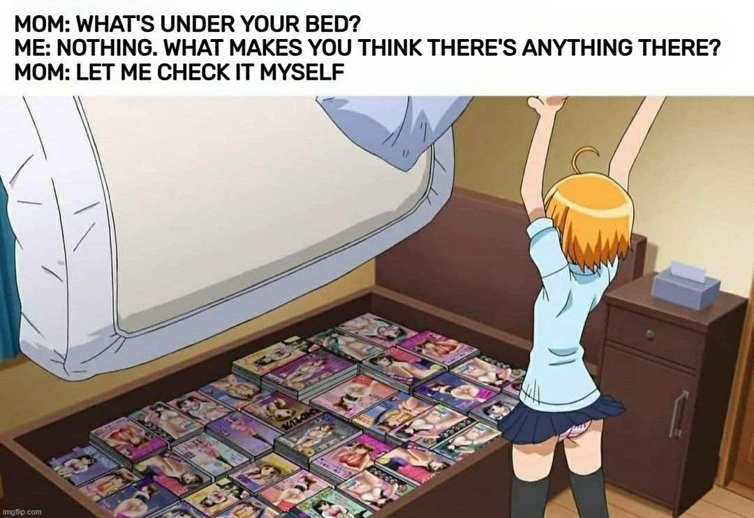 A relatable meme showing an anime girl hiding a large collection of adult DVDs under her bed when her mom decides to check, creating a funny panic moment.