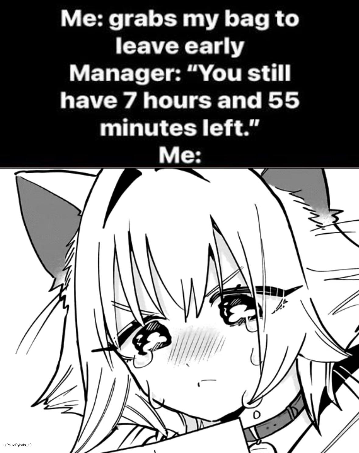 #work humor #office life #relatable #anime meme #work struggle #funny #reaction image #job stress #leaving early #manager interaction #monday blues #anime girl