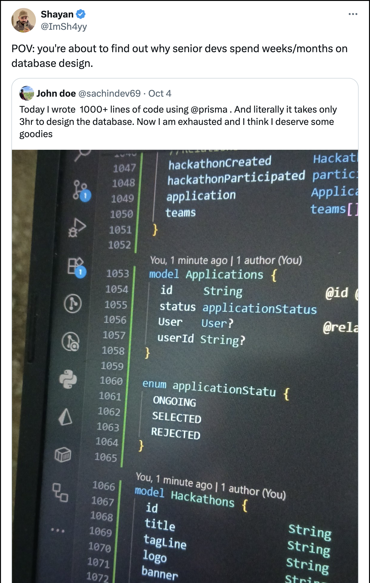 This FunnyMemes, WorkMemes, TechMemes, RelatableMemes meme features Tweet says: 'POV: you're about to find out why senior devs spend weeks/months on database design.' Below is a picture of code editor showing Prisma database models.. Created and shared on Jart.lol, this image meme represents the best of internet culture and humor.
