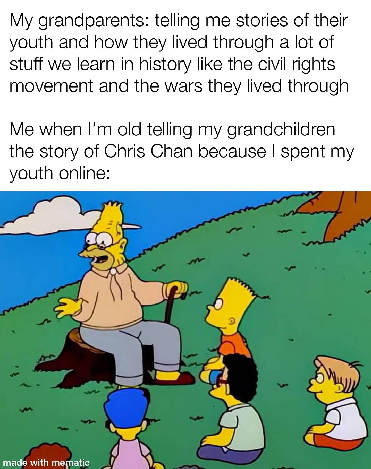 This FunnyMemes, ReactionMemes, NostalgiaMemes meme features Top text: "My grandparents: telling me stories of their youth and how they lived through a lot of stuff we learn in history like the civil rights movement and the wars they lived through Me when I'm old telling my grandchildren the story of Chris Chan because I spent my youth online:". Image: Grampa Simpson sitting on a tree stump with a cane, animated children (including Bart Simpson) seated on the grass listening attentively under a blue sky.. Created and shared on Jart.lol, this image meme represents the best of internet culture and humor.