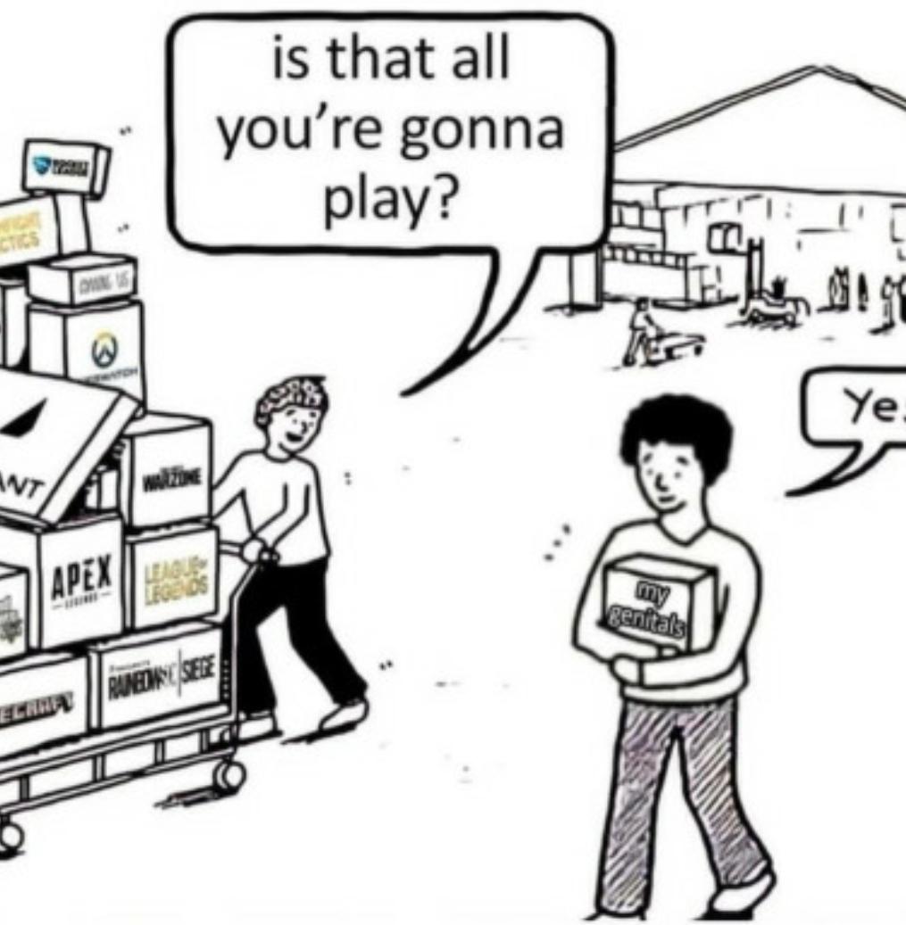 This GamingMemes, FunnyMemes meme features Comic with one person pushing cart full of video games; another holding a box labeled 'my genitals' saying 'Yes'.. Created and shared on Jart.lol, this image meme represents the best of internet culture and humor.