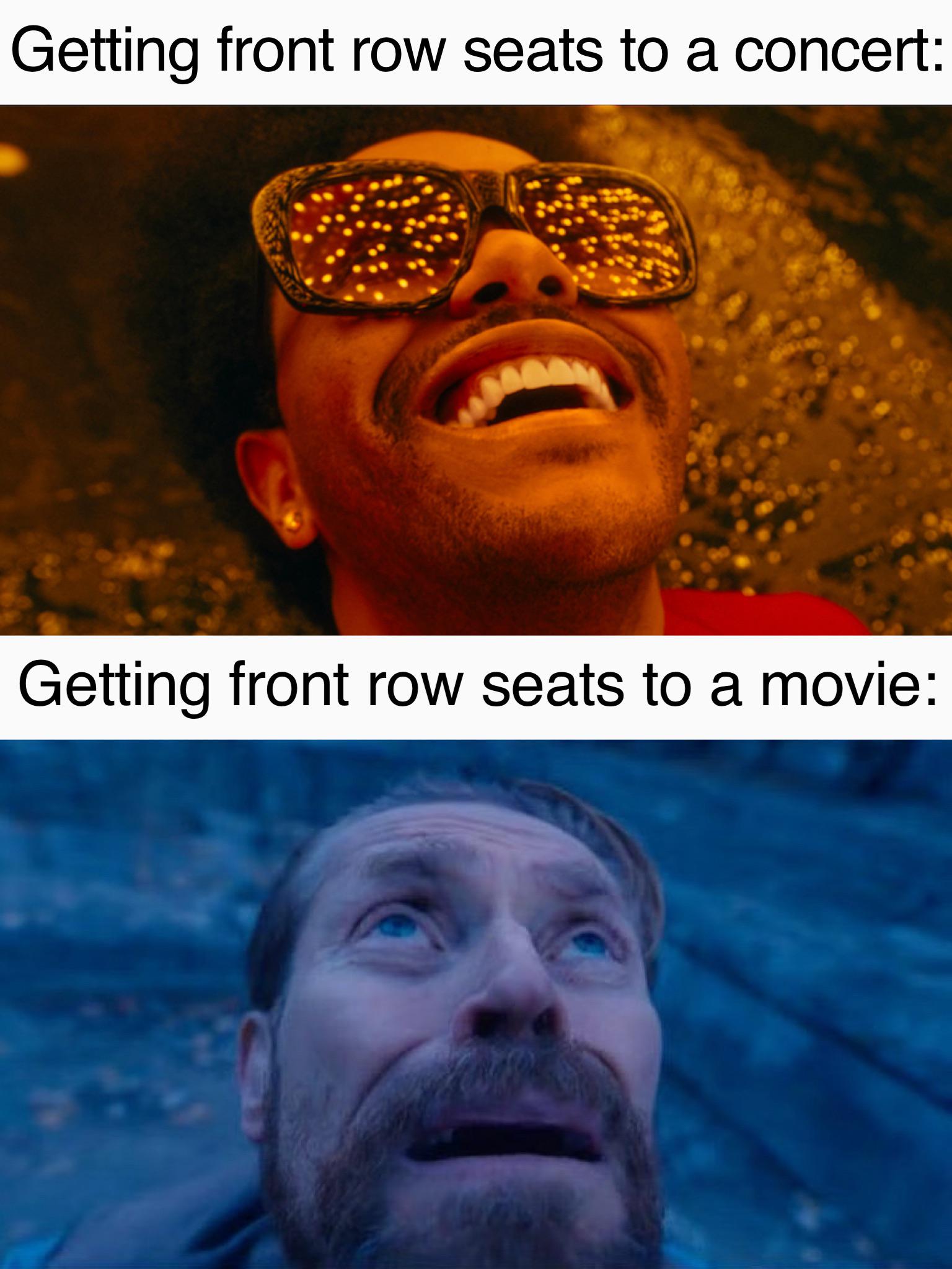 This FunnyMemes, ReactionMemes, RelatableMemes meme features Two-panel image macro. Top text: "Getting front row seats to a concert:" shows a smiling man wearing reflective sunglasses with golden lights. Bottom text: "Getting front row seats to a movie:" shows a terrified man looking up in a blue-tinted close-up.. Created and shared on Jart.lol, this image meme represents the best of internet culture and humor.