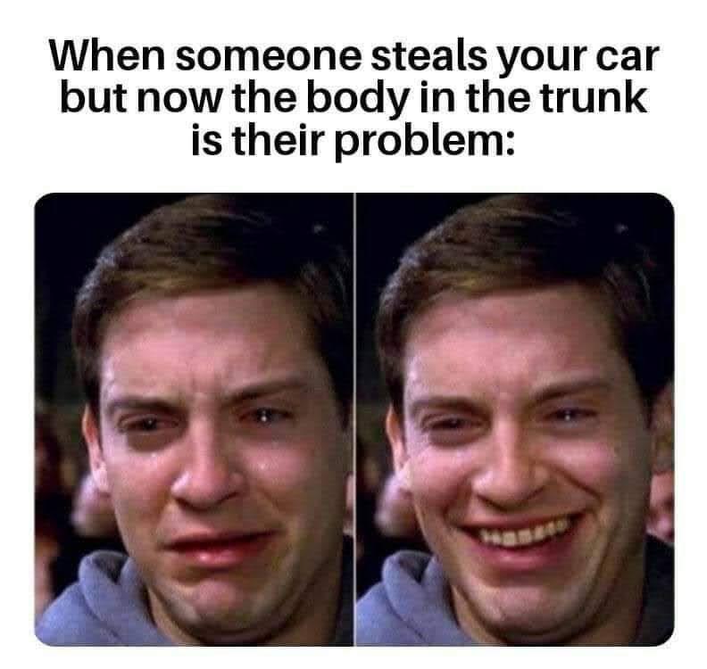 #dark humor #funny #relatable #tobey maguire #spider-man #reaction image #meme #crying to smiling #car theft #criminal logic #trending memes #internet humor