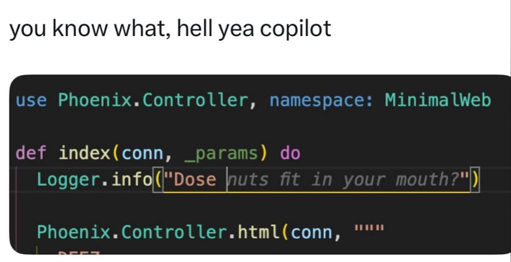#funny #coding #programming #github copilot #elixir #phoenix framework #developer humor #ai #software development #tech meme #coding humor #relatable