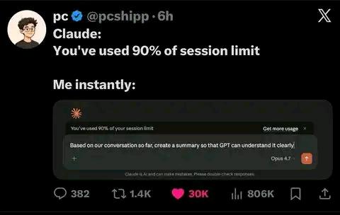 A relatable tech meme showing a user quickly summarizing an AI conversation before hitting the Claude session limit to continue the work in ChatGPT.