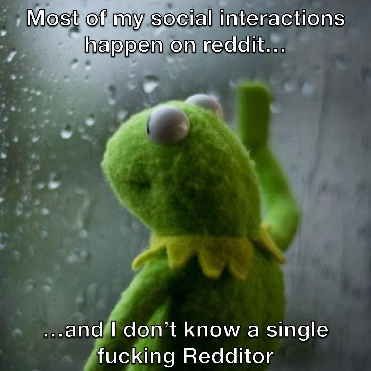 Feeling painfully relatable: Sad Kermit meme about having most social interactions on Reddit but knowing no real Redditors. Viral, funny meme, relatable.