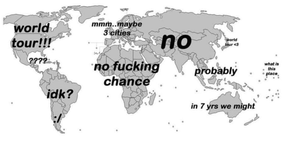 #funny #relatable #music #touring #world tour #concert #geography #artist logic #reaction meme #satire #pop culture #maps