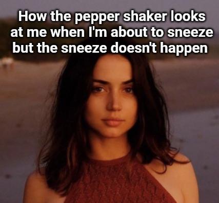 Relatable meme moment! See this epic meme showing the pepper shaker's disappointed stare when a sneeze doesn't happen. Viral memes for every mood.
