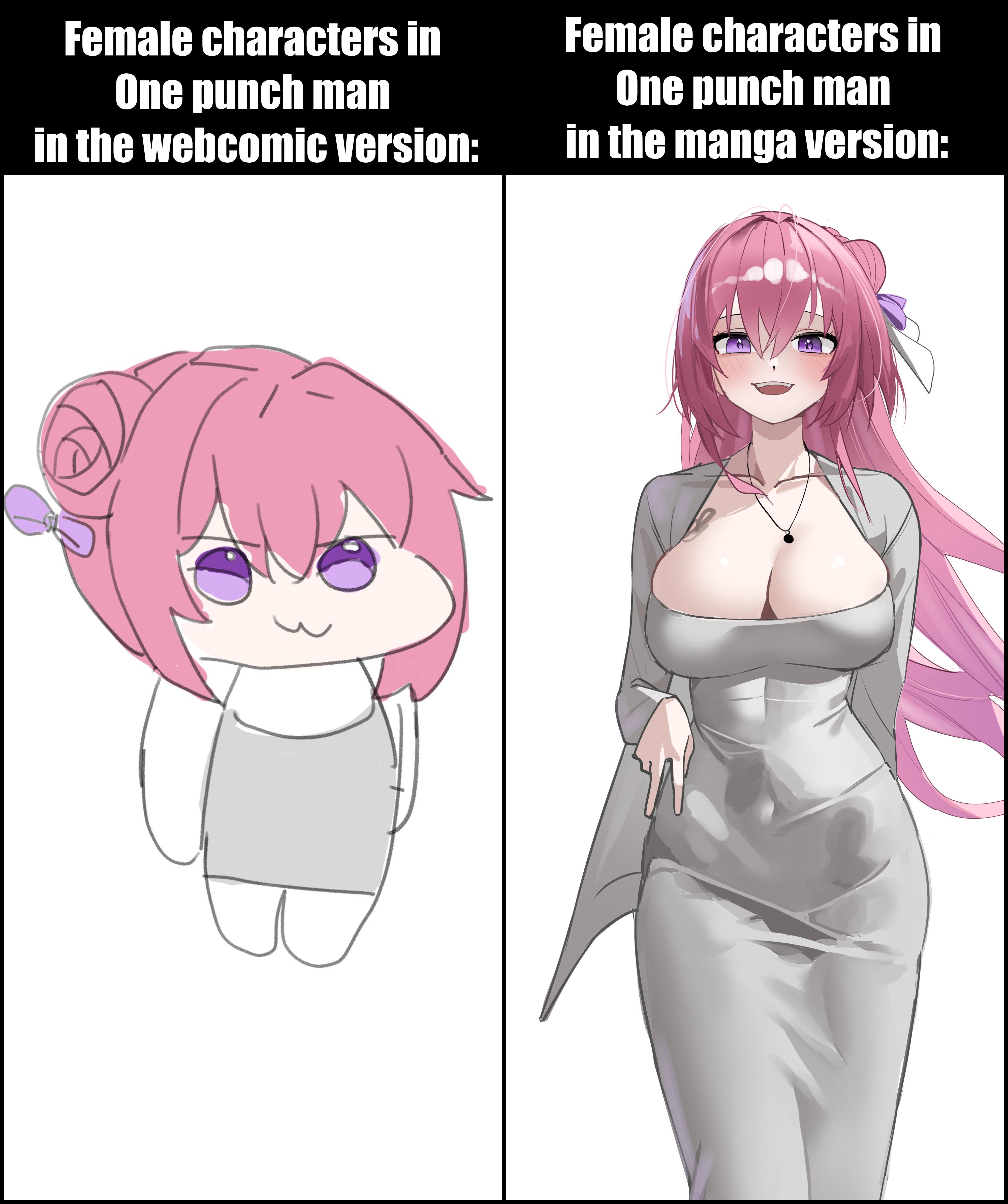 Notice the difference: viral memes comparing One Punch Man female characters in the webcomic vs manga. Chibi webcomic vs detailed manga redraw meme.