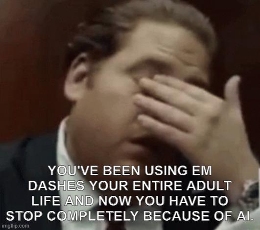 A man facepalming in frustration about changing his writing habits for AI. This relatable meme captures the struggle of modern tech adjustments in daily work.
