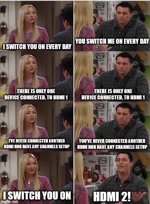 #funny #friends #joey tribbiani #phoebe buffay #tech support #tv problems #hdmi #relatable #sitcom humor #television #image macro #pop culture