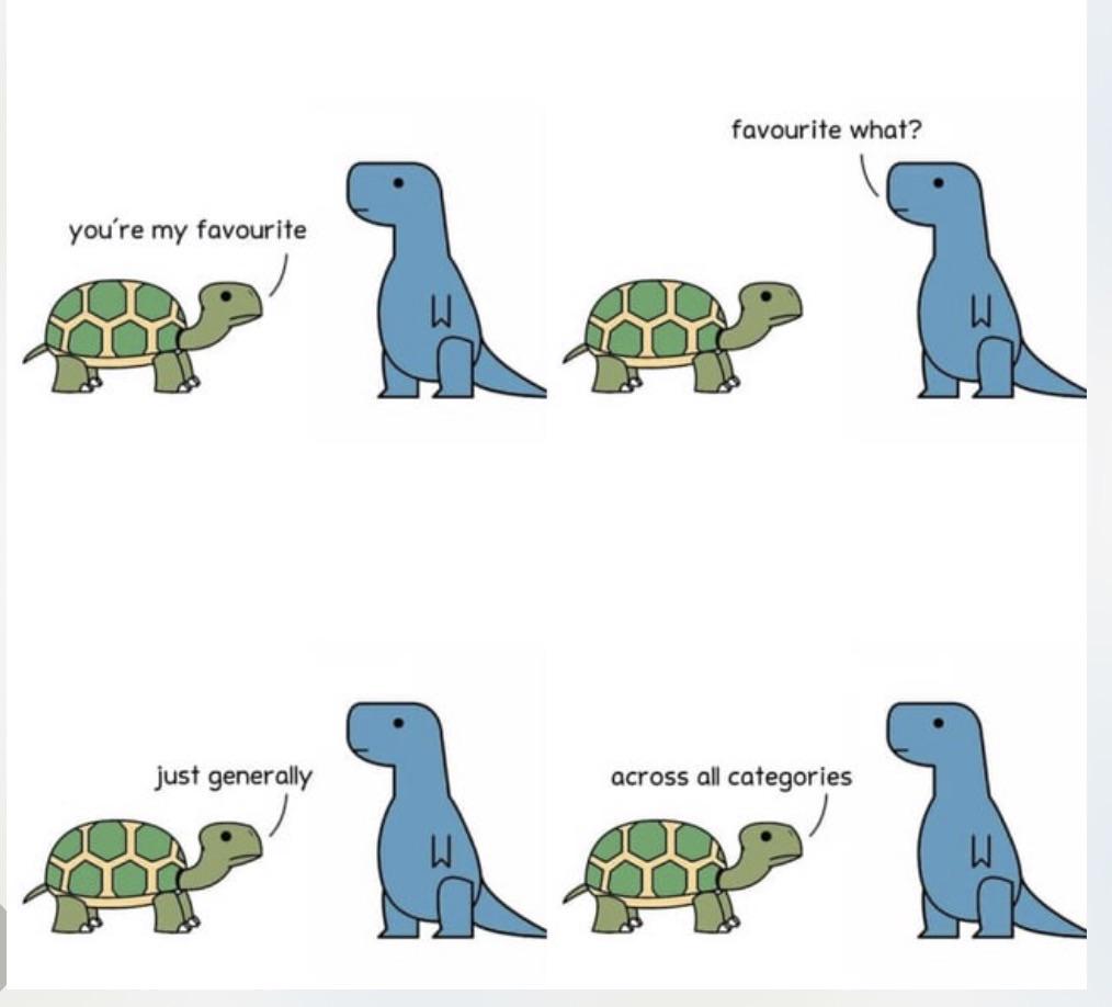 A heartwarming meme featuring a turtle telling a blue dinosaur that they are their absolute favourite, covering all categories in this wholesome comic.